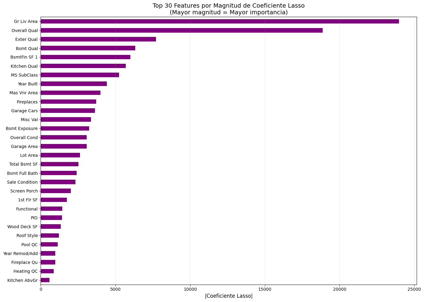 plt.title('Top 30 Features por Magnitud de Coeficiente Lasso\n(Mayor magnitud = Mayor importancia)', fontsize=14)